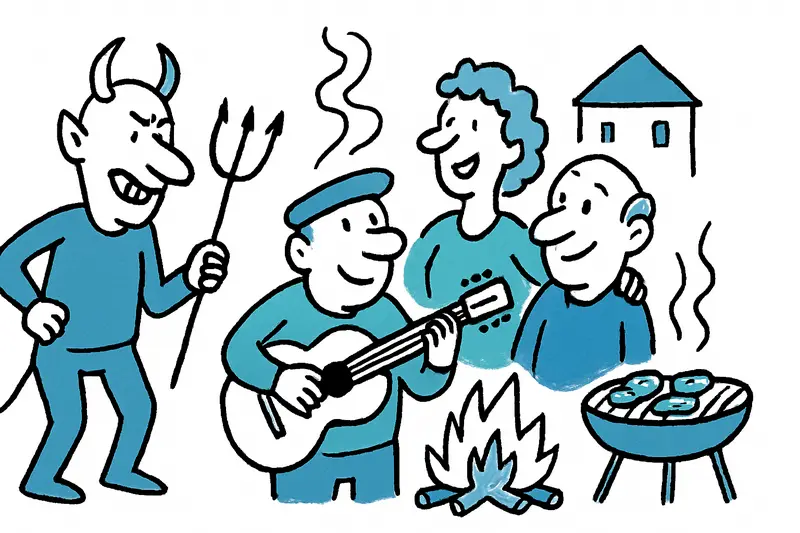 Tonight small towns light up across the island like nodes of old communities. On the Plaza Mayor in Sa Pobla the steps fill up, people shake hands, children climb the low walls — at 9:15 p.m. the devils begin their dance there. The air is a mix of smoke, charcoal and the smell of grilled meat; somewhere glass bottles clink, further back someone plucks a familiar melody on a guitar.